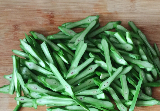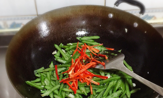 刀豆掐去两头,斜切细条,蒜切细粒,红椒切丝。