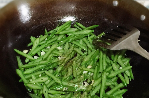 热锅加油,下入蒜末煸出香味,倒入处理好的刀豆翻炒几下,加入盐、椒盐。