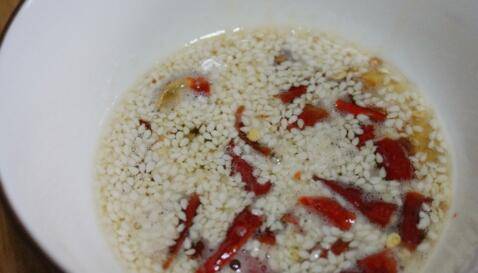 4、另拿一碗,剪入干辣椒段。加入适量白芝麻。锅中放入适量的油,没热后倒入碗中,形成辣椒油。