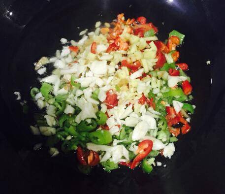 5、热锅热油,下姜蒜辣椒,翻炒两下。