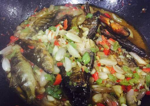 用料:小鱼干100g、葱头一把、姜一小块、蒜头4瓣、青辣椒3个、红辣椒3个、盐两小勺。