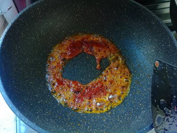 2、炒锅洗净烧热,放入少许食用油,加入番茄酱、白糖,小火慢慢炒出红油。