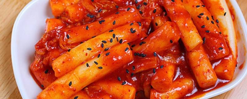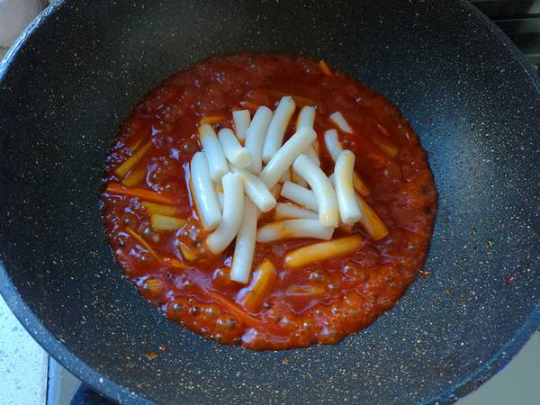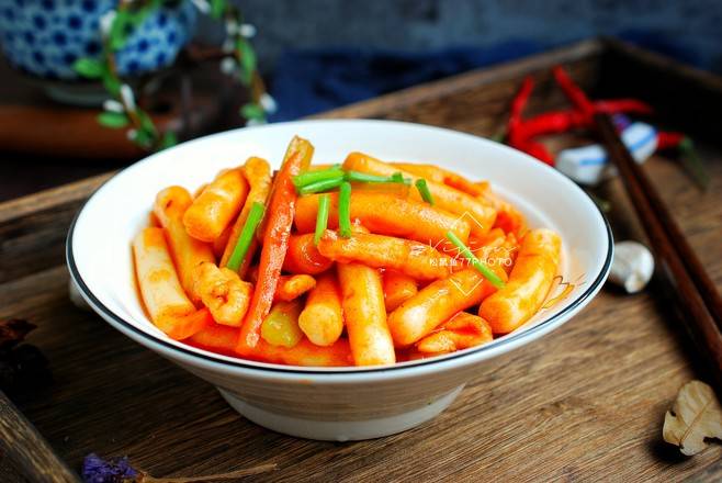 4、加入一点点清水,把年糕条放进锅里,翻炒均匀即可。