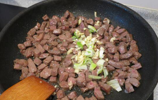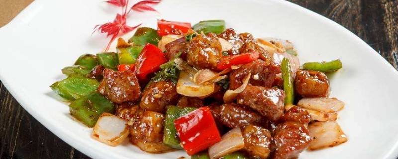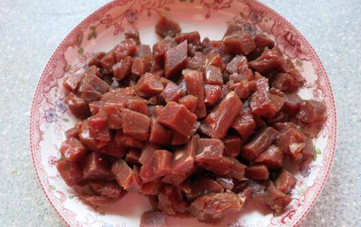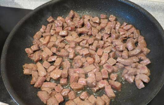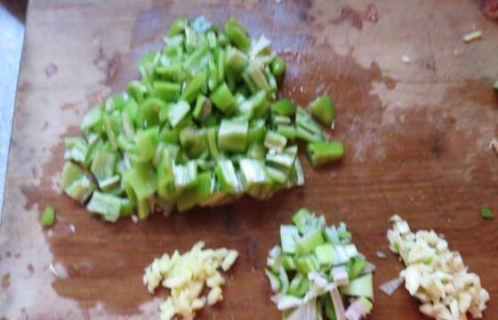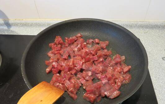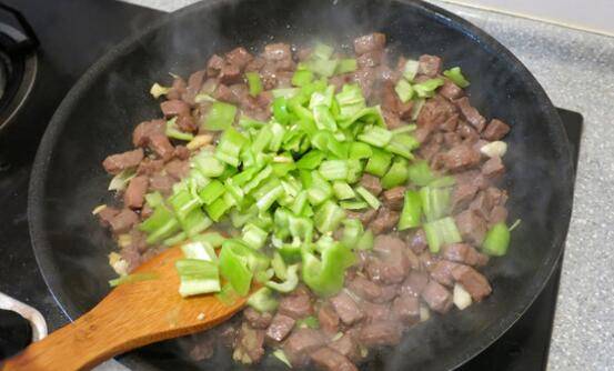 8、放入青椒丁翻炒,待肉丁7成熟时。