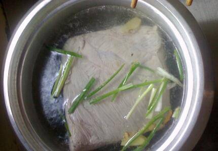 将五花肉清洗干净,五花肉和姜片、葱段少许黄酒、清水一起入锅,煮至猪肉断生。