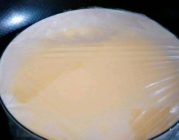 4、用保鲜膜封住碗口,用牙签在保鲜上插几个小孔,锅中加入水,把鸡蛋液放入锅中蒸10分钟。