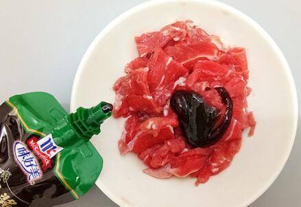 1、牛肉顶刀切片,加入1茶匙料酒,2茶匙黑胡椒酱。