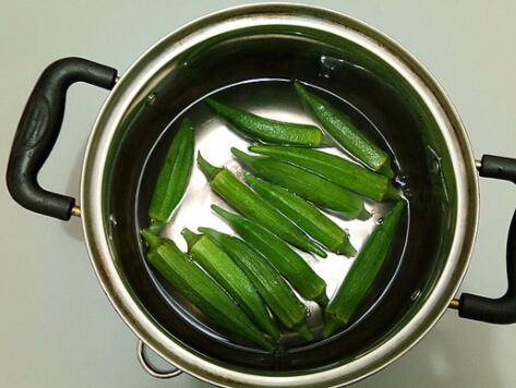 3、腌制牛肉的时候把秋葵洗净放入沸水中煮分钟捞出。