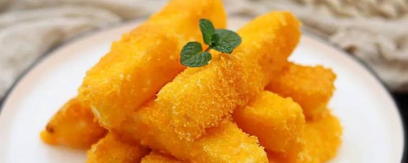 放入奶片,依次均匀裹上淀粉、蛋液、面包糠。