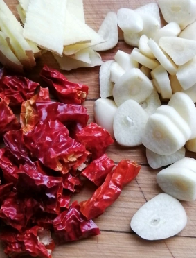 五花肉切均匀的片,姜蒜切片,干辣椒切段。