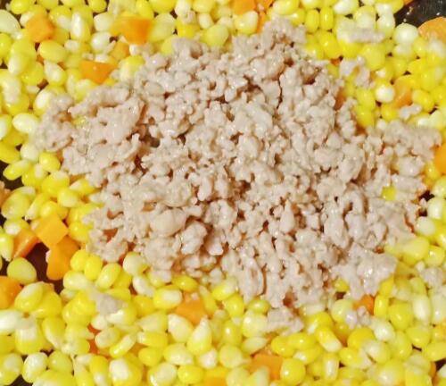 7、锅中热油,下蒜末爆香,倒入玉米粒和胡萝卜丁翻炒。