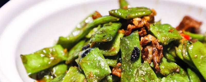 6、加入辣椒、扁豆、鸡粉、盐大火翻炒。