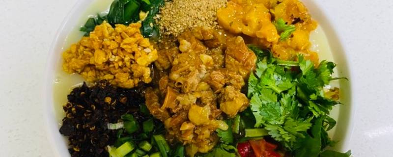 1、准备材料:豌豆粉一小碗、生抽适量、蒜油2勺、肉末半碗、韭菜一小把、葱3根、香菜1根、小米辣适量、花生碎适量、树番茄1个、油辣椒适量、米干400克。
