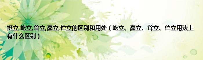 屹立,矗立,耸立,伫立用法上的区别为:意思不同、侧重点不同、出处不同。一、意思不同1、屹立:像山峰一样高耸而稳固地立着。2、矗立:高耸地立着。3、耸立:高高地直立。4、伫立:长时间地站着。二、侧重点不同1、屹立:常比喻人的意志十分坚定无法动摇,也指人的面貌,精神等等。2、矗立:一般用于物,不用于人。3、耸立:在高的山或物上放置,着眼于高,高而突出地立着。4、伫立:没有动作,一般用于刻画人物和事物的形象。三、出处不同1、屹立:鲁迅《野草·一觉》:“我照作品的年月看下去,这些不肯涂脂抹粉的青年们的魂灵便依次屹立在我眼前。”2、矗立:周而复《上海的早晨》第三部十六:“巧珠奶奶远远望见一座大建筑物,红墙黑瓦,矮墙后面有一根旗杆矗立在晚霞里。”3、耸立:孙厥《新儿女英雄续传》第十九章:“四周本没有栅栏,只有成行的大树在昏暗里森然耸立。”4、伫立:柯云路《三千万》:“丁猛凝视着窗外伫立了一会儿。”