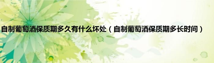 自制葡萄酒的保质期与选用的葡萄品种、酿造方法、储存方式有关。一般自制葡萄酒4周酿造,可保存1至2年。一些葡萄酒在高质量的储存条件下可以保存长达5年甚至更长时间。陈酿6周的酒,只要质量合适,可以无限期使用,但2年后就会停止陈酿。