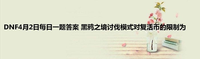 DNF开启了每日一题活动,这次的活动里我们需要在公众号上回答题目,如果正确回答的话就能领取到一些奖励。黑鸦之境讨伐模式对复活币的限制为?这是地下城与勇士4月2日的题目,下面小编带来了具体答案,希翼大家喜欢。
