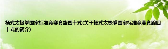 大家好,杨式太极拳国家标准竞赛套路四十式,关于杨式太极拳国家标准竞赛套路四十式的简介很多人还不知道,现在让我们一起来看看吧!