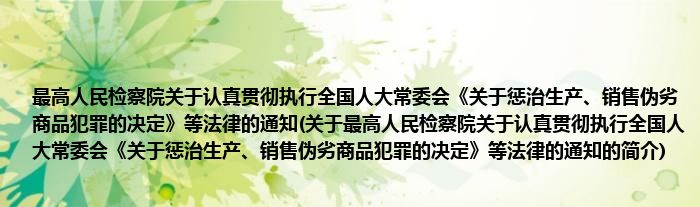 1、 最高人民检察院关于认真贯彻执行全国人大常委会《关于惩治生产、销售伪劣商品犯罪的决定》等法律的通知在1993.07.21由最高人民检察院颁布。