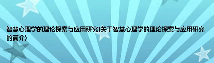 大家好,智慧心理学的理论探索与应用研究,关于智慧心理学的理论探索与应用研究的简介很多人还不知道,现在让我们一起来看看吧!