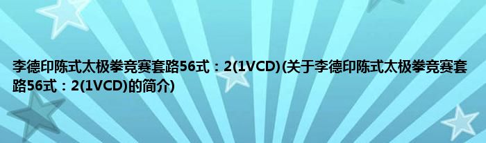 1、 《李德印陈式太极拳竞赛套路56式:2(1VCD)》是黑龙江文化音像出版社出版的VCD音像制品。