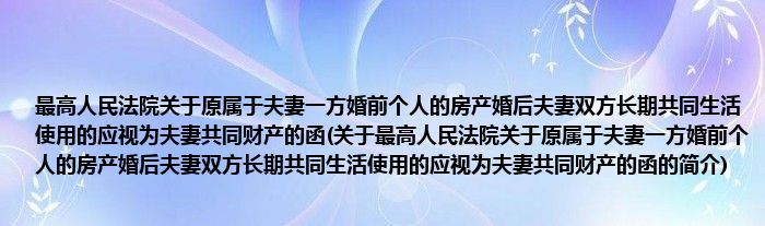 本文关于最高人民法院关于原属于夫妻一方婚前个人的房产婚后夫妻双方长期共同生活使用的应视为夫妻共同财产的函的简介就讲解完毕,希望对大家有所帮助。