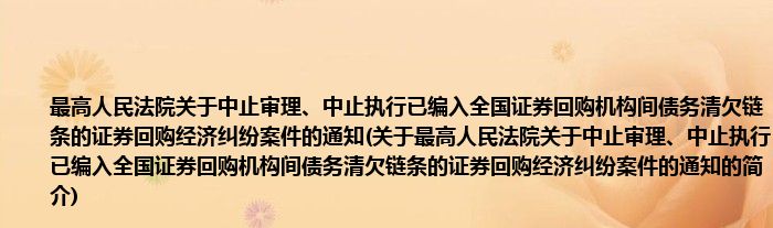 本文关于最高人民法院关于中止审理、中止执行已编入全国证券回购机构间债务清欠链条的证券回购经济纠纷案件的通知的简介就讲解完毕,希望对大家有所帮助。