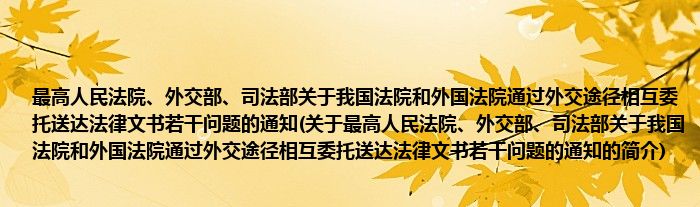 本文关于最高人民法院、外交部、司法部关于我国法院和外国法院通过外交途径相互委托送达法律文书若干问题的通知的简介就讲解完毕,希望对大家有所帮助。