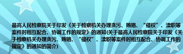 本文关于最高人民检察院关于印发《关于检察机关办理贪污、贿赂、“侵权”、渎职等案件时相互配合、协调工作的规定》的通知的简介就讲解完毕,希望对大家有所帮助。
